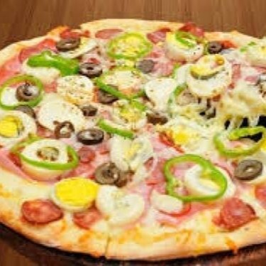 Presunto, muçarela, ovo cozido, azeitona, pimentão, cebola, tomate, milho, orégano e molho de tomate com ervas finas. (12 fatias)