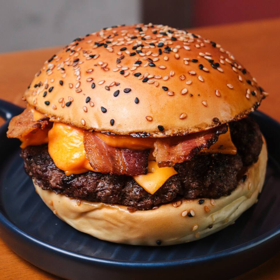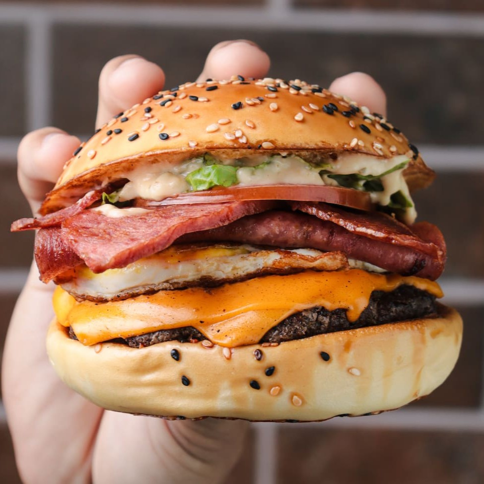 Delicie-se com nosso irresistível burguer: pão amanteigado com gergelim, carne suculenta de 150g, queijo cheddar cremoso, presunto, ovo, calabresa, alface fresquinha, tomate e molho mac.