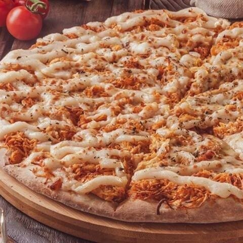 Frango desfiado, muçarela, cebola, tomate, azeitona, milho, orégano e molho especial de tomate com ervas finas. (10 fatias)