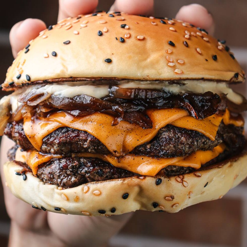 Delicie-se com nosso Duplo Brasão, pão amanteigado com gergelim, com 2 suculentos blend de carne de 150g assado na brasa! Com duplo queijo cheddar derretido, cebola caramelizada e um toque especial de maionese caipira.