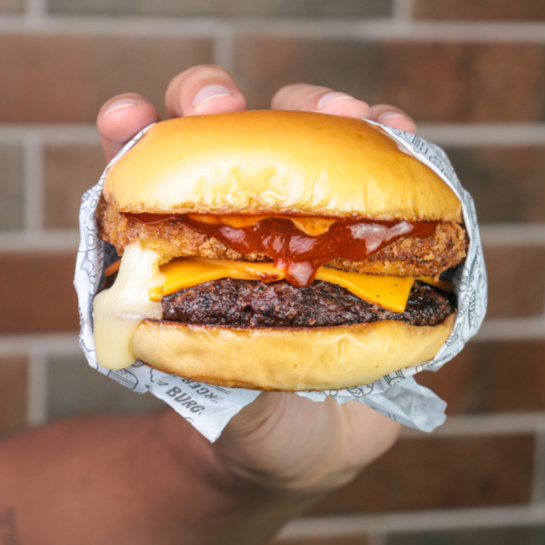 Pão brioche selado na manteiga, blend 180g assado na brasa, queijo empanado, molho barbecue e molho Mac.