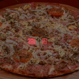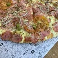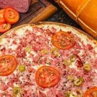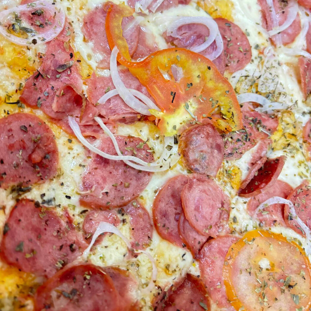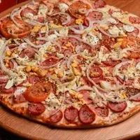 Molho de tomate, queijo mussarela, calabresa, presunto, cebola, tomate, azeitona e orégano.
