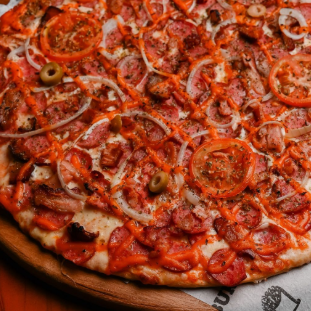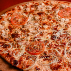Molho de tomate, queijo mussarela, calabresa, bacon, cebola, tomate, azeitona e orégano.
