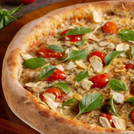 Molho de tomate, queijo mussarela, frango, catupiry, cebola, tomate, azeitona e orégano.