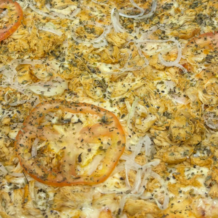Molho de tomate, queijo mussarela, frango, cebola, tomate, azeitona e orégano.