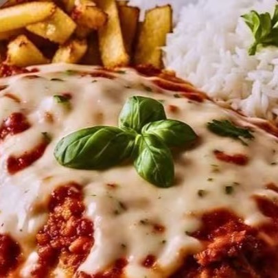 Filé de frango,arroz branco, batata frita,queijo,presunto e molho de tomate
