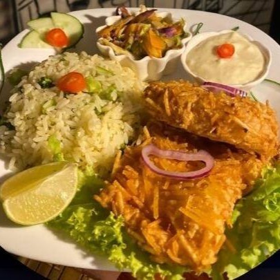 Filé de peixe recheado com banana,queijo e presunto,arroz,purê,farofa e vinagrete