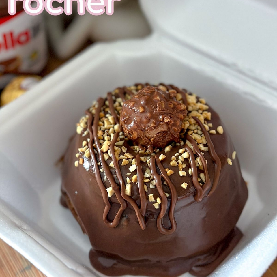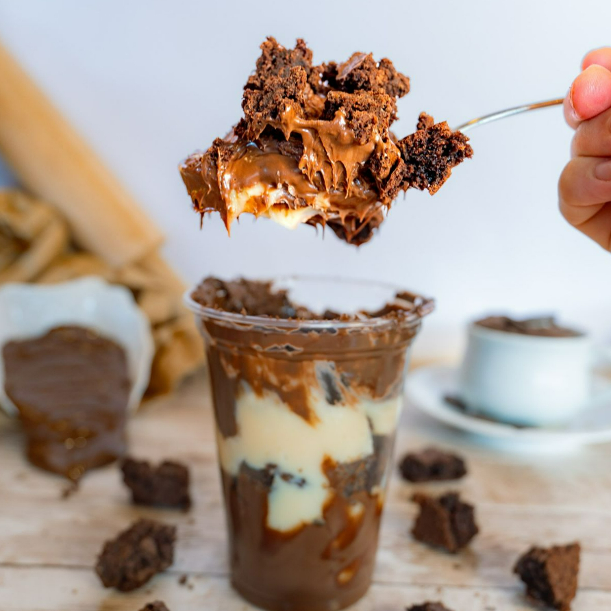 Casca de chocolate, recheada com brigadeiro cremoso e ninho e chocolate 50%, intercalada com brownie.