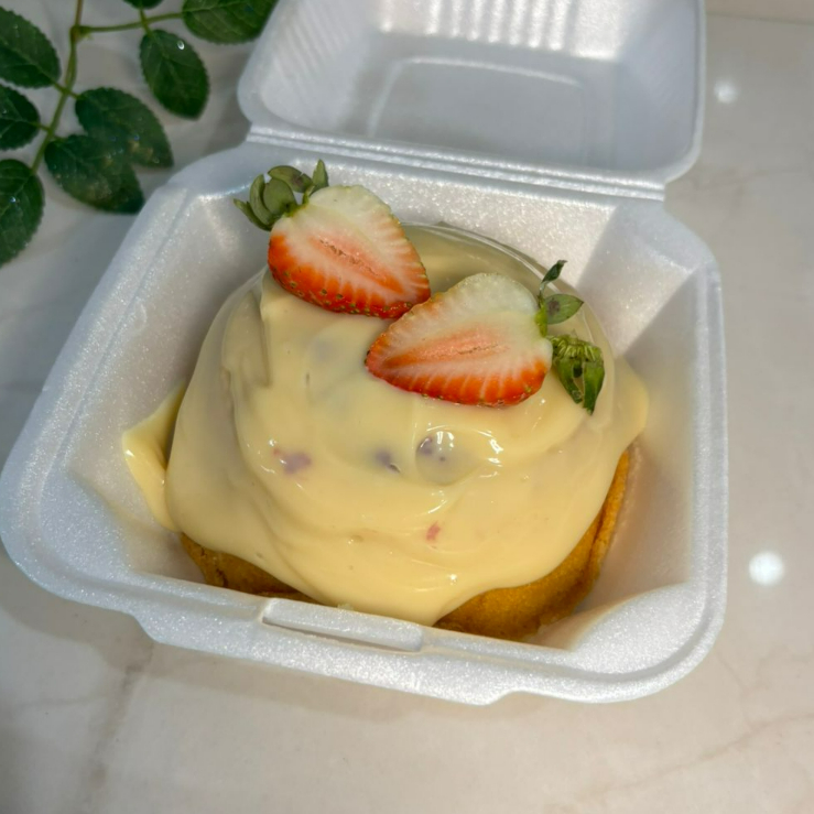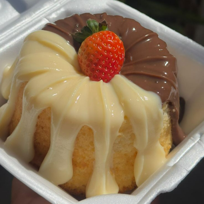 Massa Fofinha e saborosa, coberta com um cremoso brigadeiro branco, finalizado com geleia de cupuaçu e lascas de castanha.