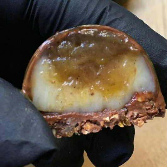 Casca de 250g com recheio cremoso de brigadeiro de ninho, intercalado com doce de cupuaçu e castanhas laminadas, finalizado com media de 450g a 500g.