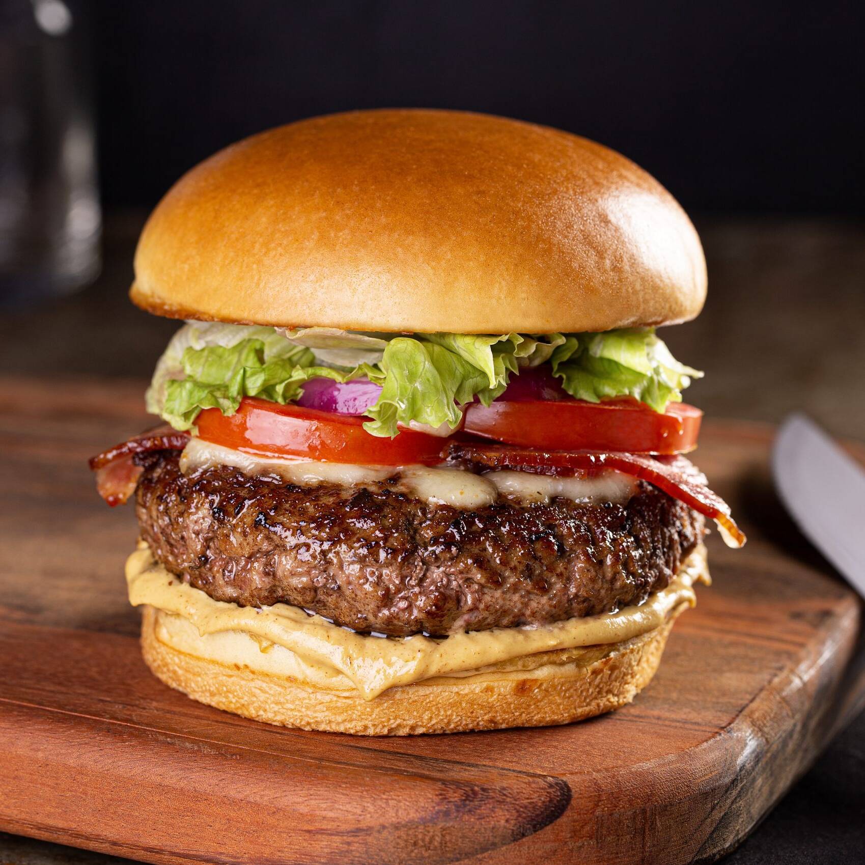 PÃO DE BRIOCHE, BURGUER DE CARNE BOVINA,OVOS,SALADA(ALFACЕ, TOMATE,PEPINO.