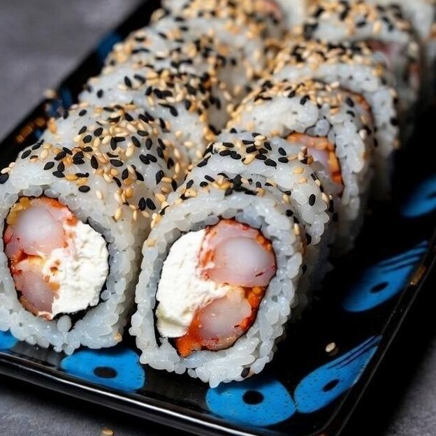 Alga nori, arroz, gergelim torrado, camarão e cream cheese