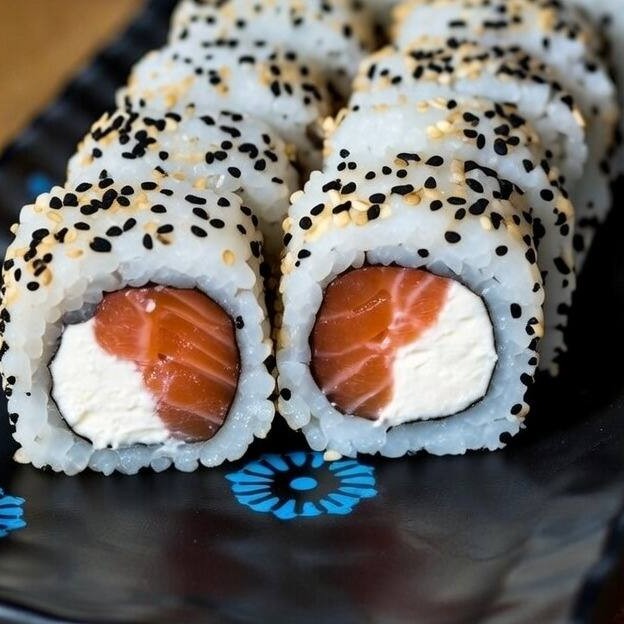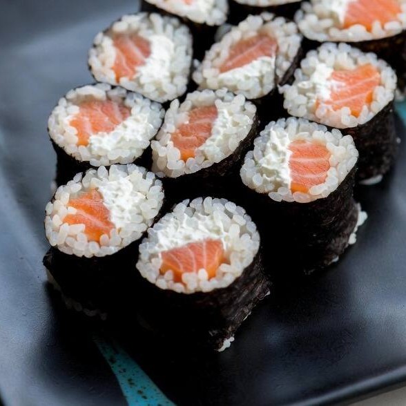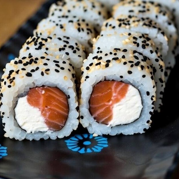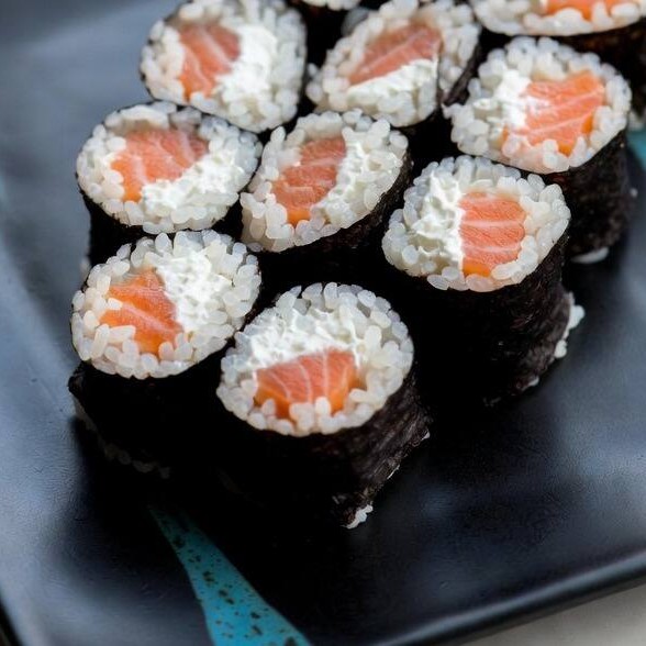 Alga nori, arroz, gergelim torrado, salmão e cream cheese