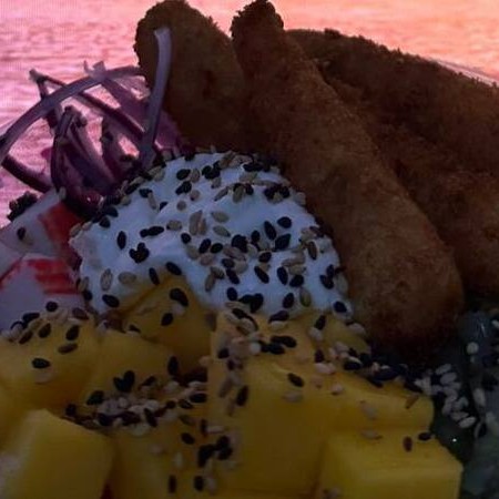 Arroz, manga, cebola roxa, sunomono, salmãofrito, camarão frito, kani, cream cheese e gergelim torrado