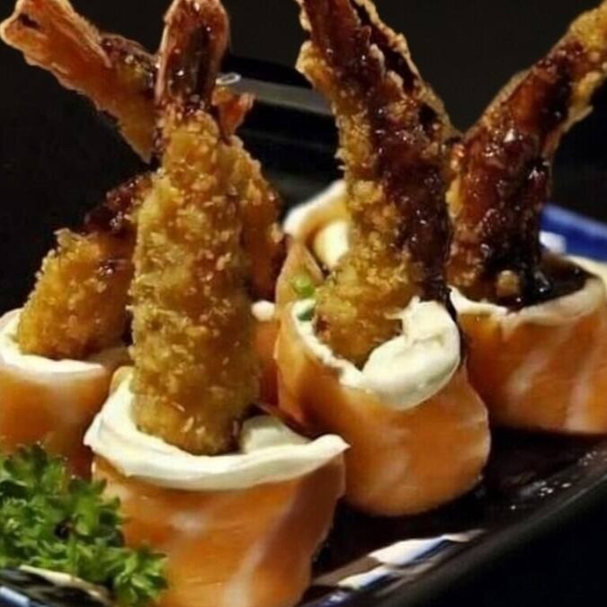 Camarão empanado, lâmina de salmão, cream cheese e cebolinha