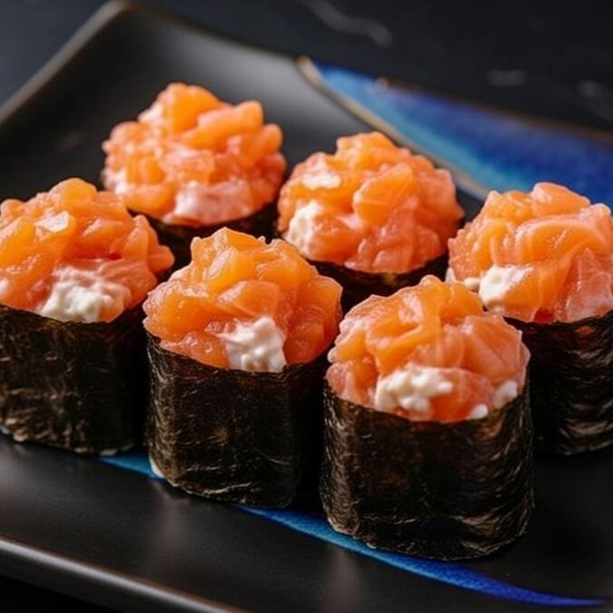 Alga nori, arroz, salmão cortado em cubos, cream cheese