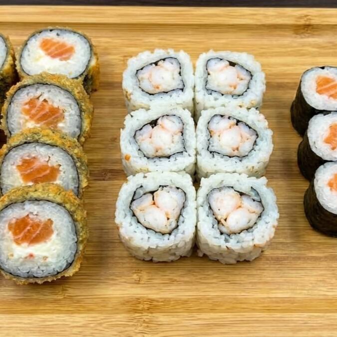Alga nori, arroz, salmão cortado em cubos, camarão cortado em cubos e cream cheese