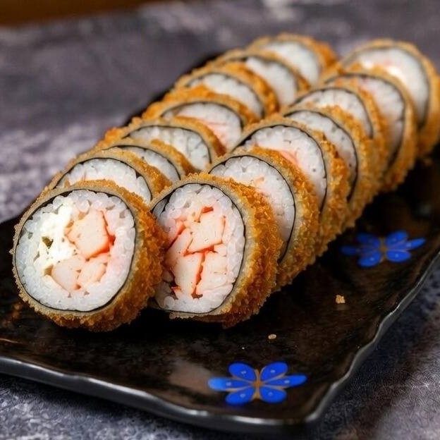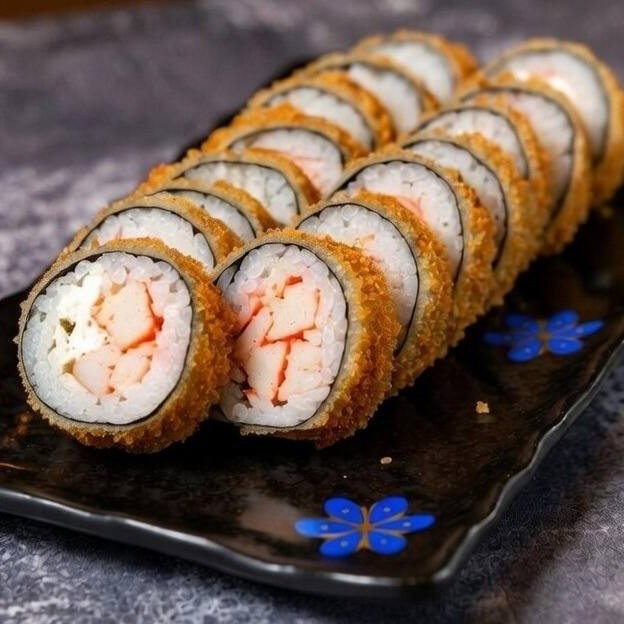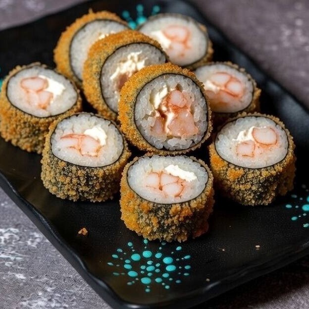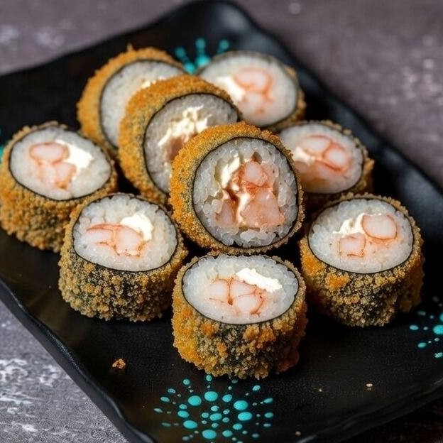 Alga nori, arroz, kani, cream cheese, empanado e frito