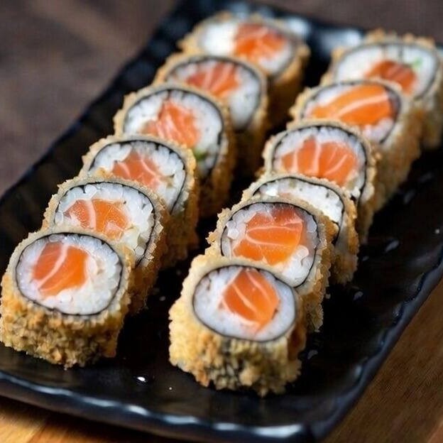 Alga nori, arroz, salmão, cream cheese, empanado e frito