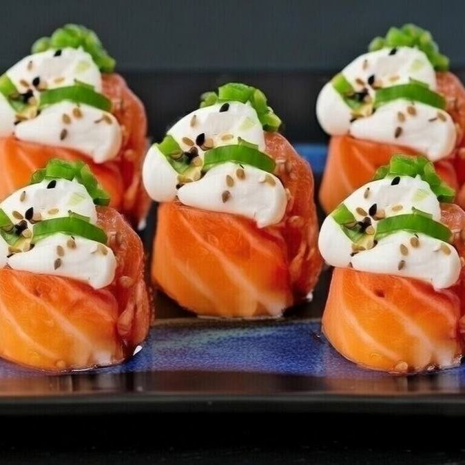 Tartar de salmão, arroz, alga nori, óleo de gergelim, gergelim torrado, cream cheese e cebolinha