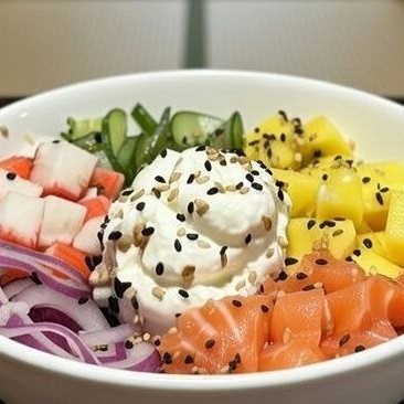 Arroz, manga, cebola roxa, sunomono, salmão, kani, cream cheese, gergelim torrado