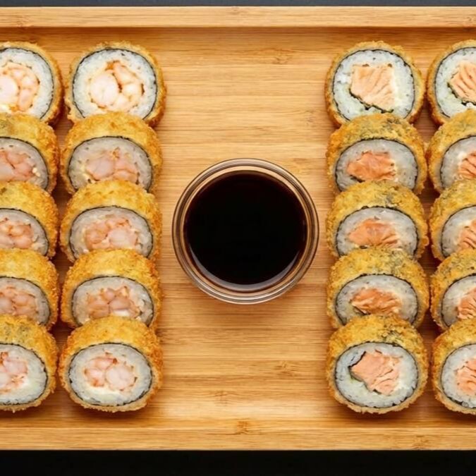 Alga nori, arroz, salmão, camarão, cream cheese, empanado e frito