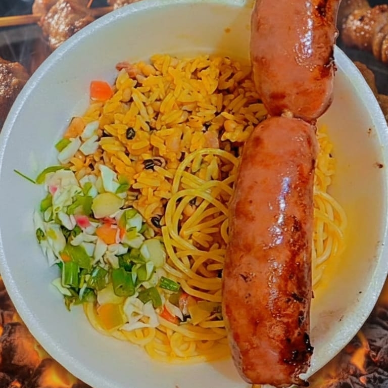 Acompanha baião macarrão salada e farofa