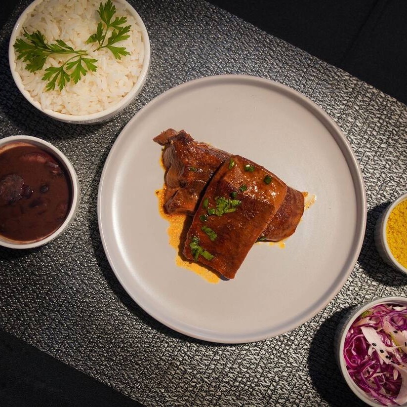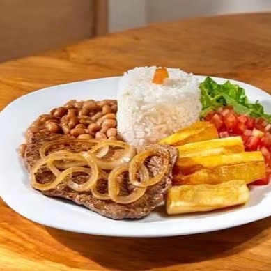 Acompanha arroz, feijão, macarrão, farofa e salada.