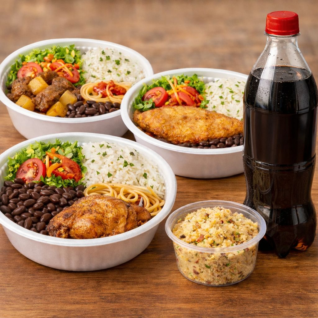 3 Marmitas de 750 gramas : 1 Carne Assada de Panela, 1 Frango de Forno, 1 peixe Crocante, 1 Refrigerante litro