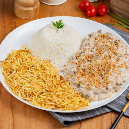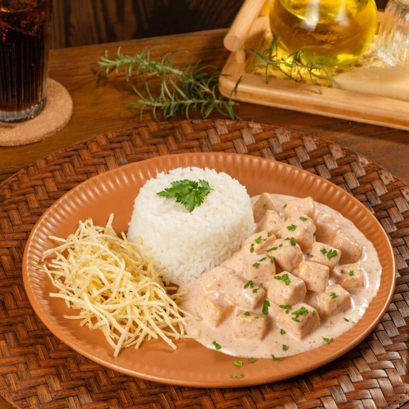 Alcatra em tiras fininhas, num delicioso estrogonofe com creme de Catupiry e aquele toque final do alho frito. Estrogonofe : 300 gr Arroz : 250 gr Batata palha : 35 gr