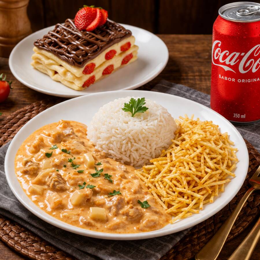 Um combo pensado pra matar sua fome de verdade: Escolha seu estrogonofe favorito, acompanhado de uma queca doce irresistível e refrigerante bem gelado. Perfeito pra quem quer praticidade, sabor e uma refeição completa em um só pedido.