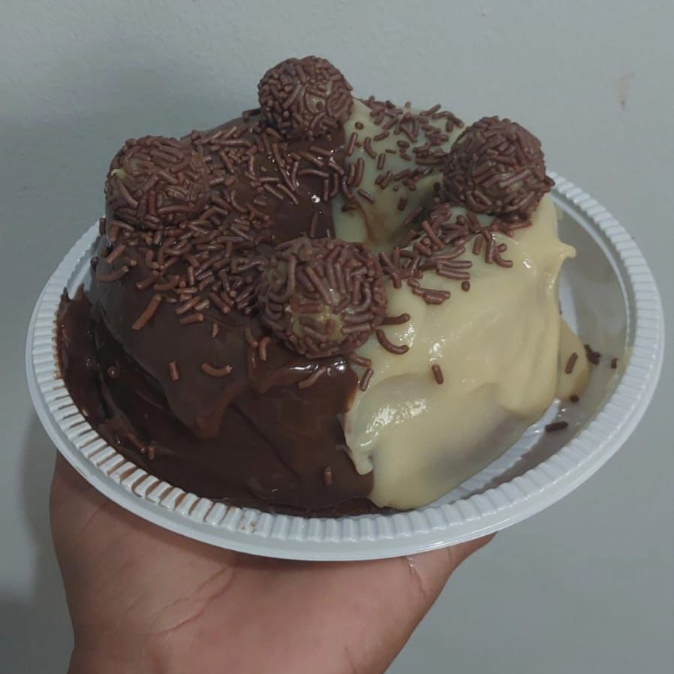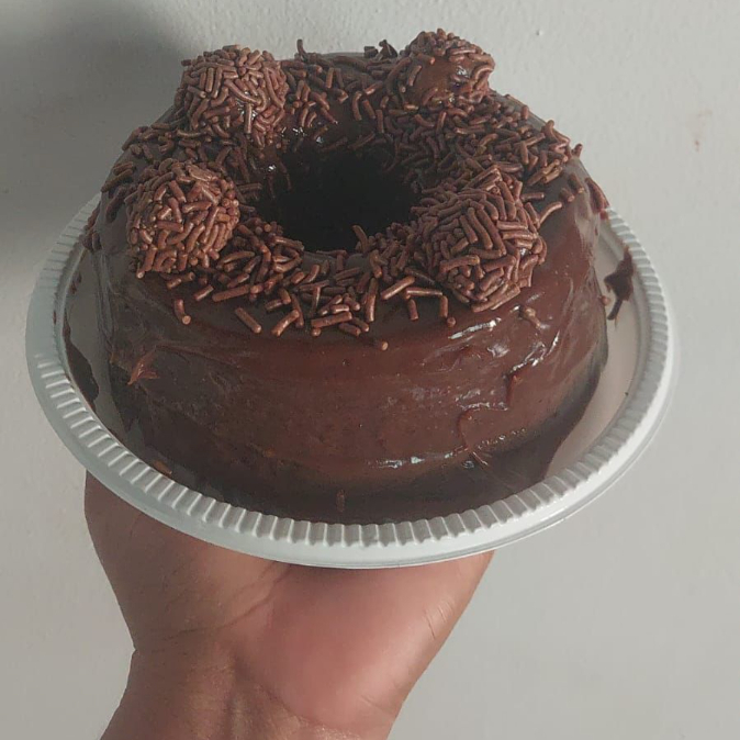 Bolo e recheio feito com cacau 50%, finalizado com brigadeiro e granulados tradicionais