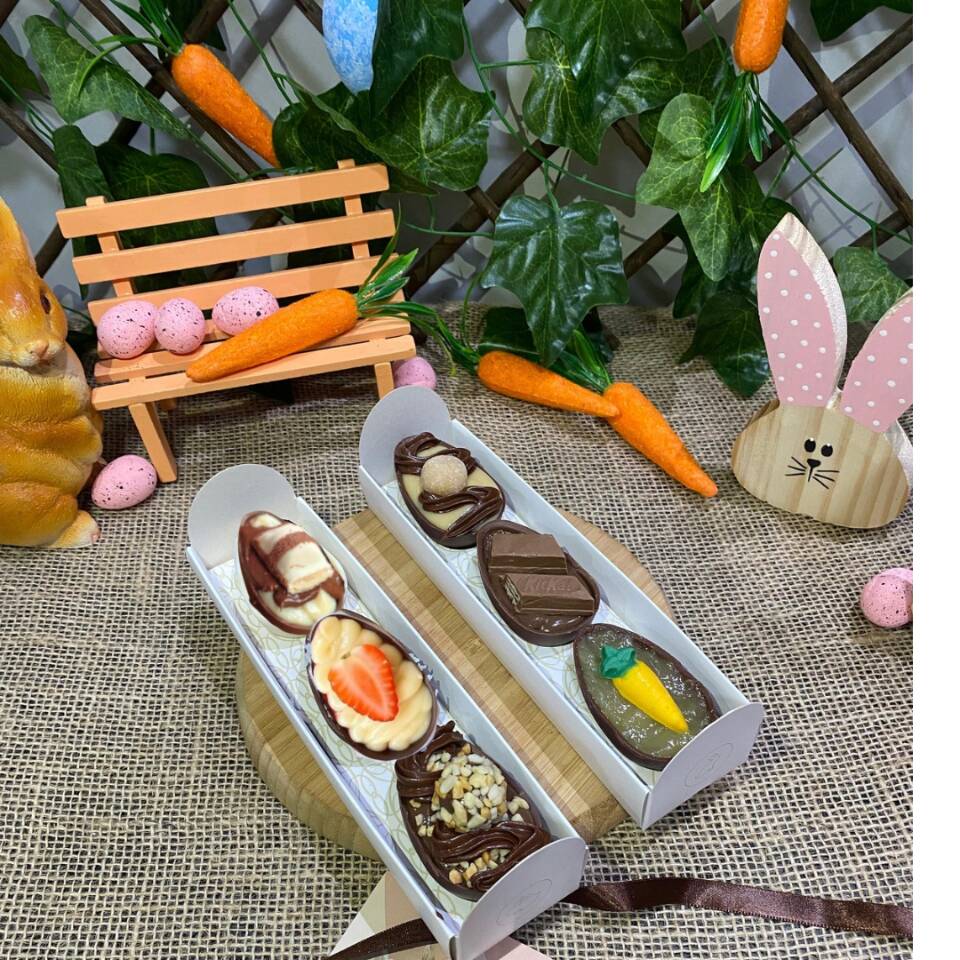 3 meios ovos de 50g. Ninho com Nutella, brigadeiro com KitKat e ninho com cupuaçu.
