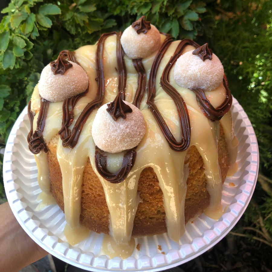 Bolo de baunilha, recheio de ninho, finalizado com nutella e brigadeiros.