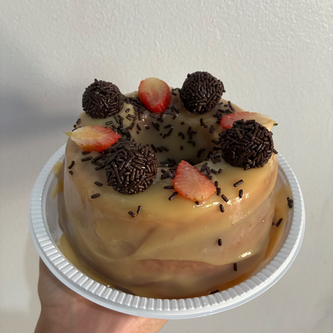 Bolo de baunilha, recheio de ninho, finalizado com morangos e brigadeiros.