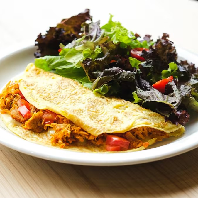 Delicioso omelete recheado de frango suculento e temperado, muçarela derretida e tomate fresquinho cortado em cubos. Acompanha nossa salada do Dia feita com ingredientes frescos e selecionados.