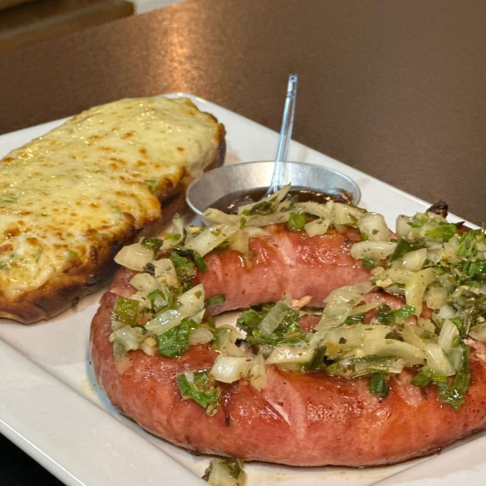 Linguiça enroladinha com pão de alho.