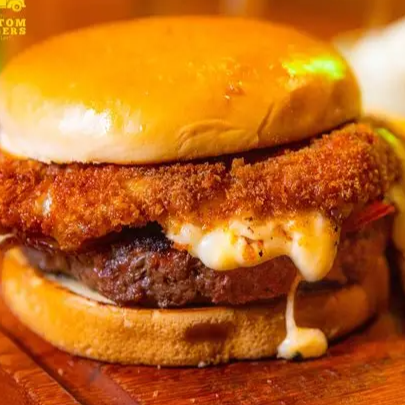 carne 160 g , disco de mussarela empanado, bacon, cebola caramelizada e maionese da casa