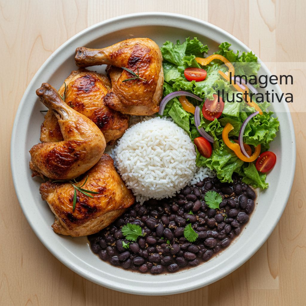 Frango Assado saboroso servido com arroz branco, feijão, macarrão, salada de maionese, farofa. (Imagem ilustrativa)
