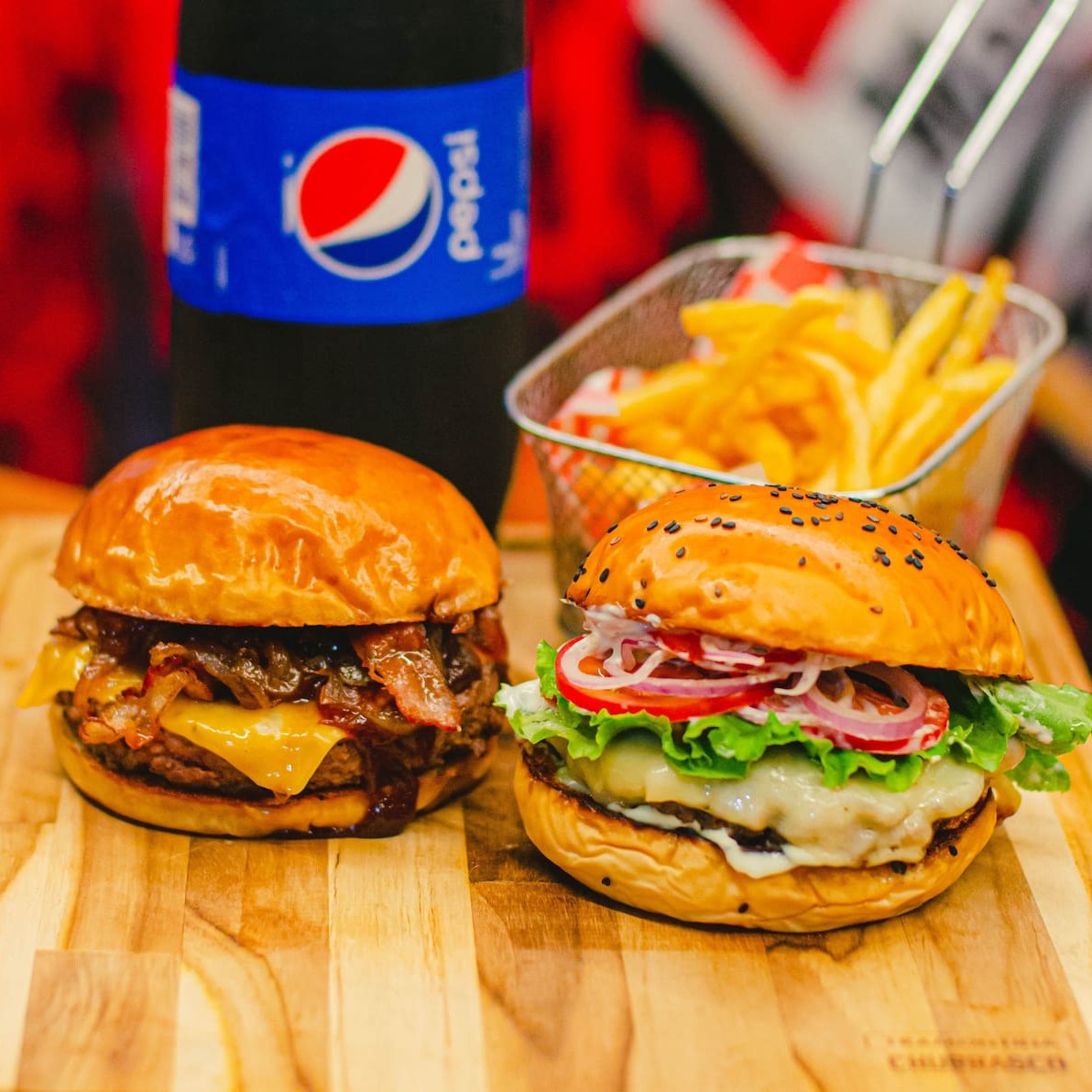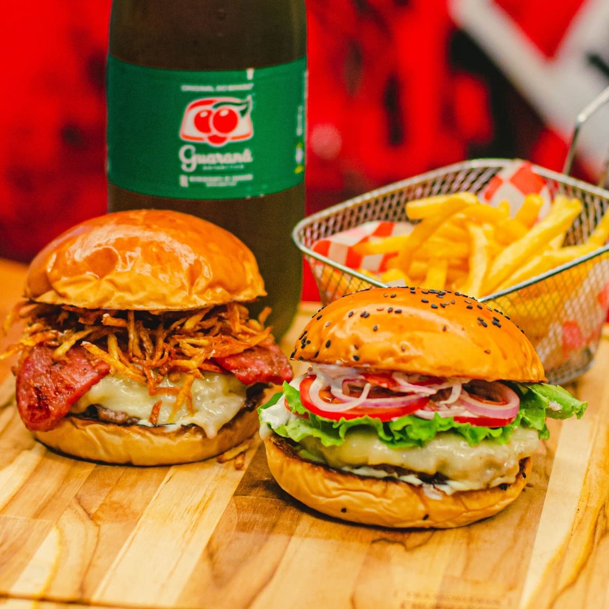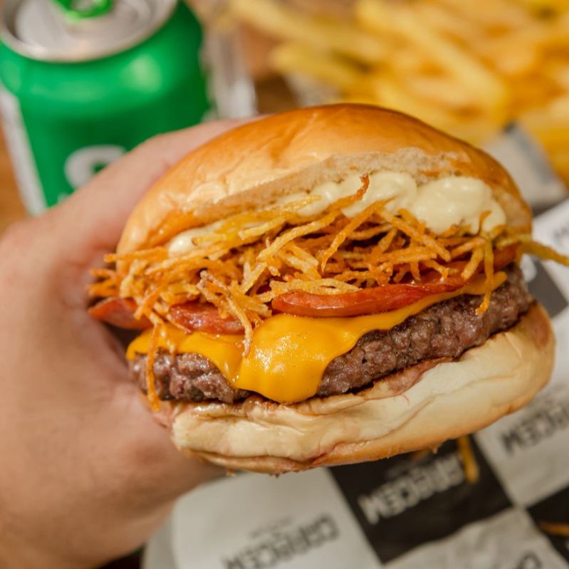 Pão amanteigado, duplo smash com cebola, salsa e azeite, duplo american cheese, bacon em tiras, cebola crispy e molho tasty.
