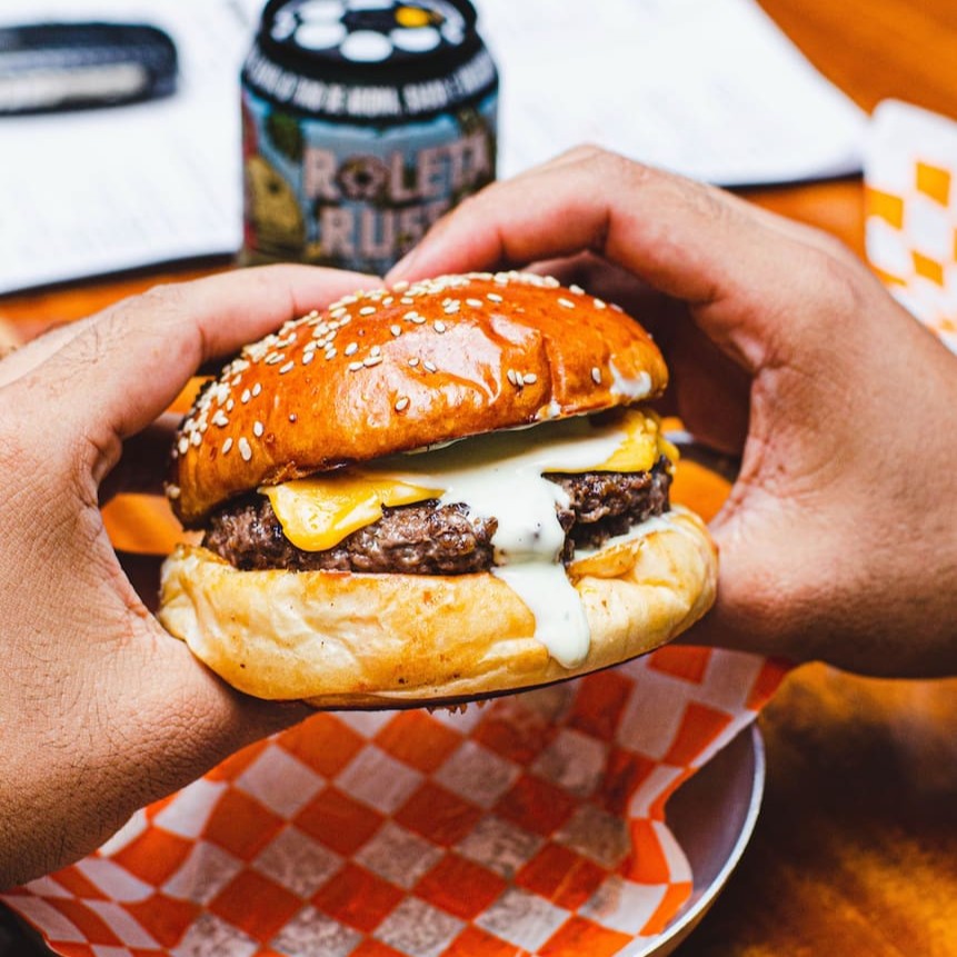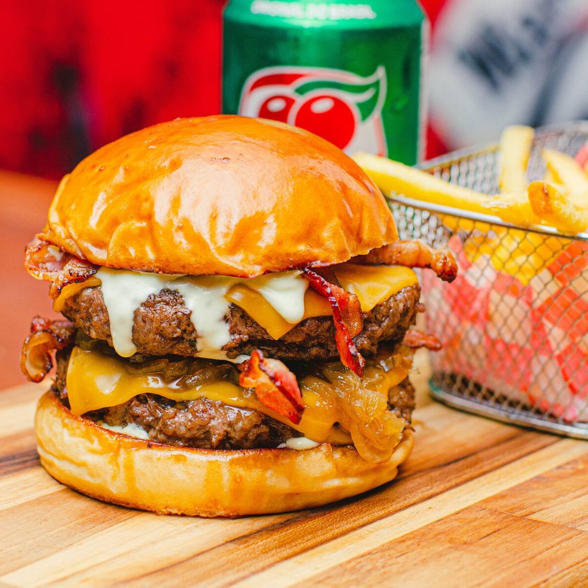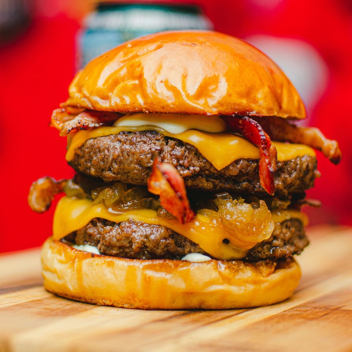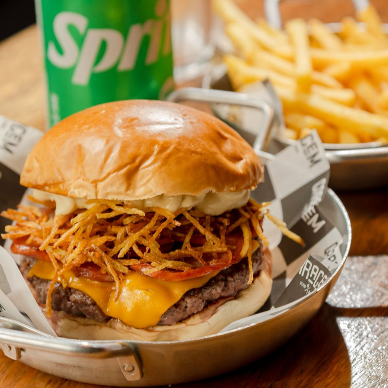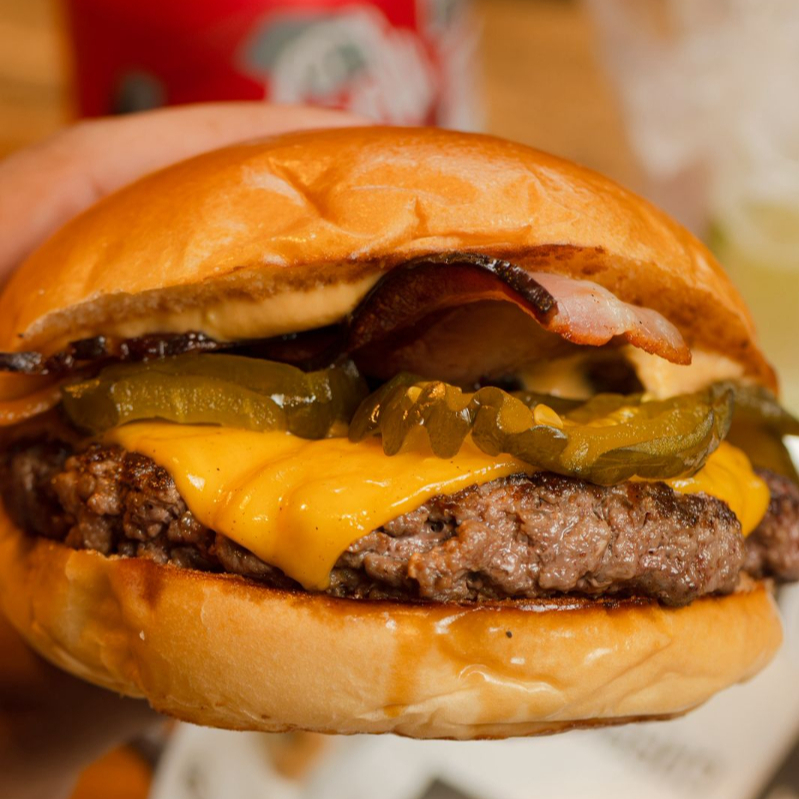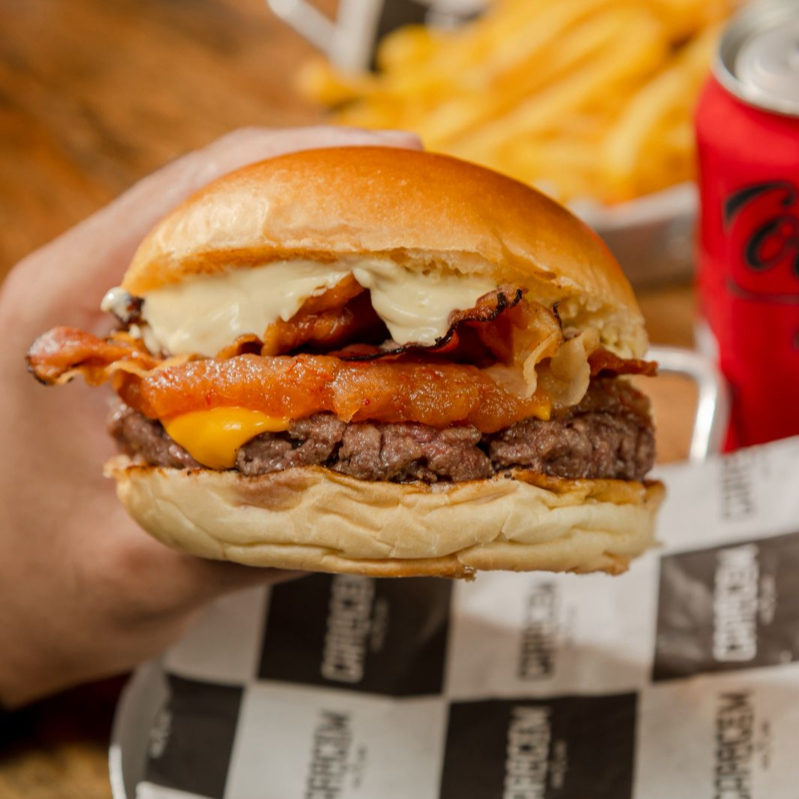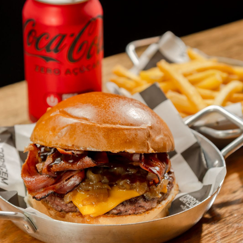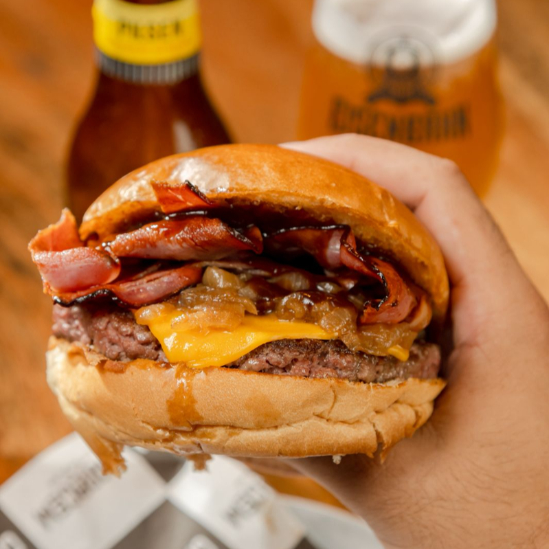 Pão selado na chapa, dois blends de 150g, duplo American cheese, cebola caramelizada, bacon e maionese da casa.