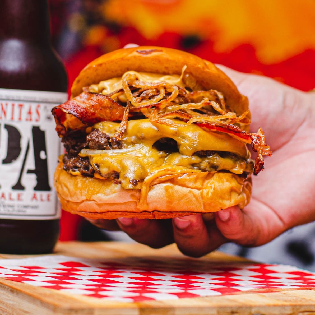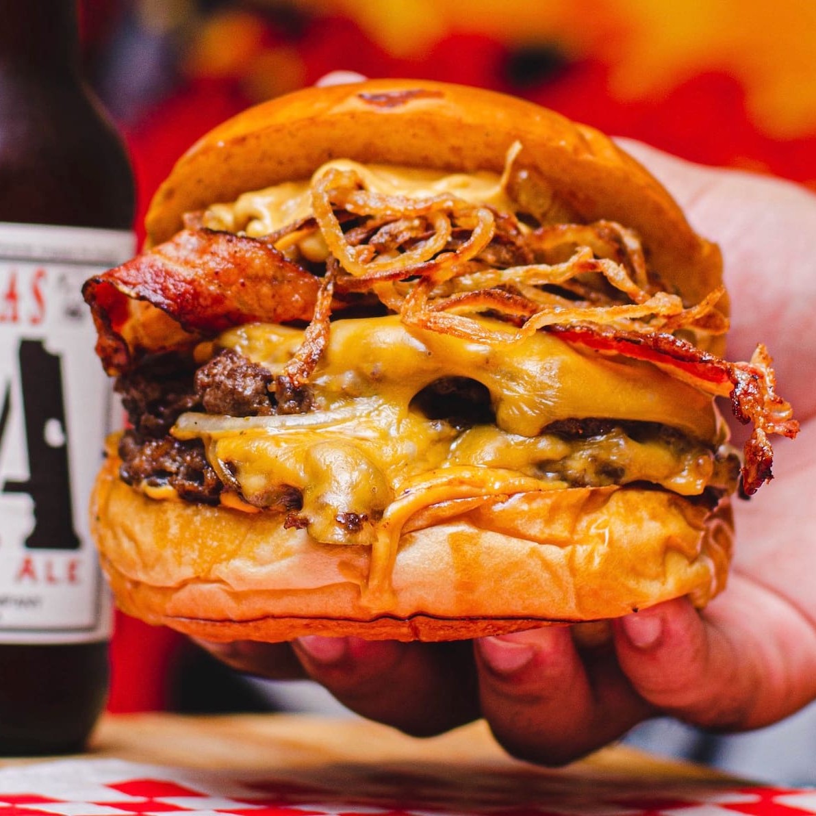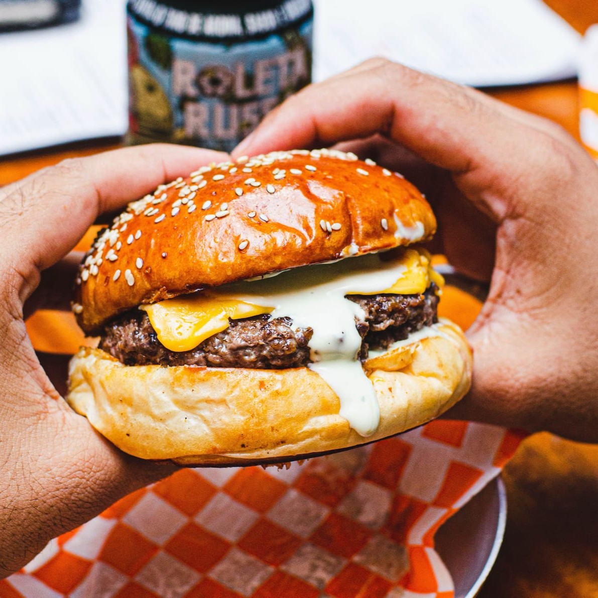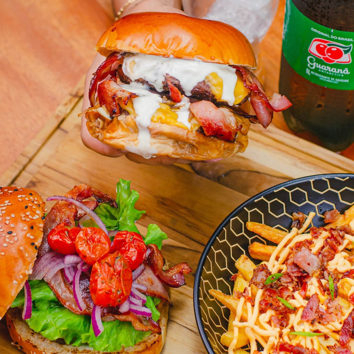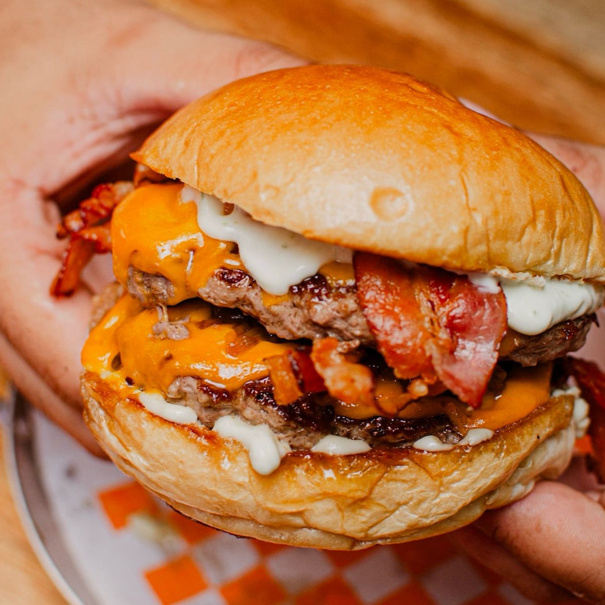 Pão selado na chapa, dois blends de 150g, duplo American cheese, cebola caramelizada, bacon e maionese da casa.