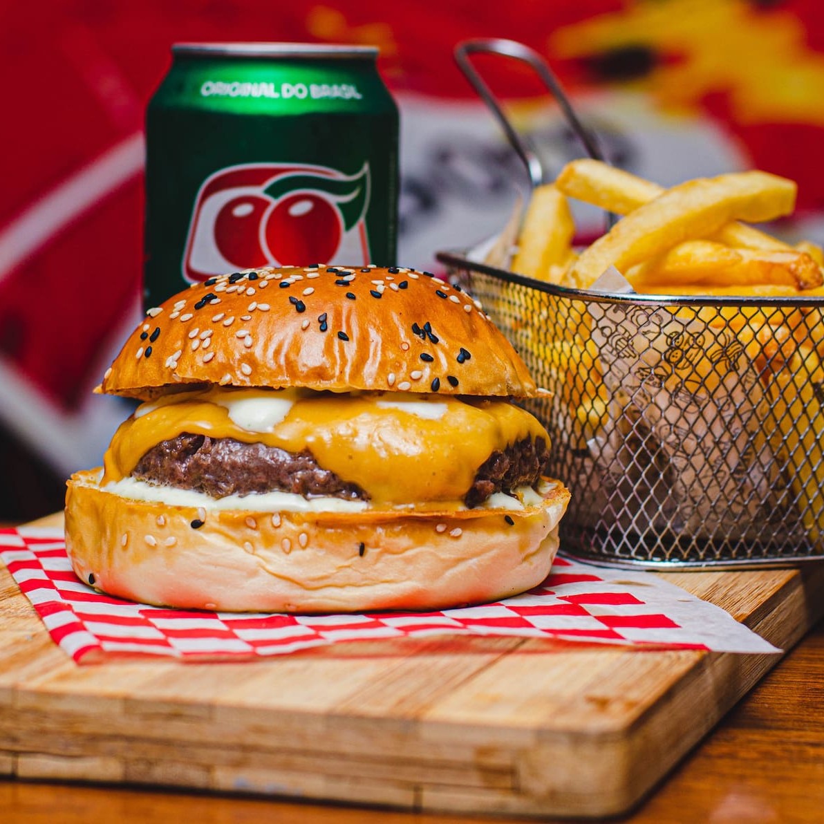 Hambúrguer Kadett, hambúrguer Corcel, batata frita e refrigerante de 1 litro
