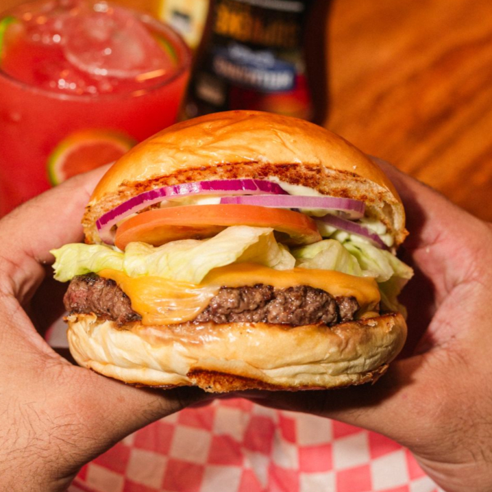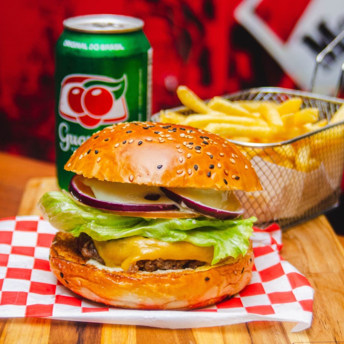 Pão amanteigado selado na chapa, blend 150g, american cheese, alface, tomate, cebola roxa e maionese da casa.