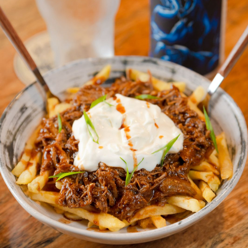 Batata frita G, costela suína agridoce desfiada, sour cream, molho chipotle, gergelim torrado e cebolinha.