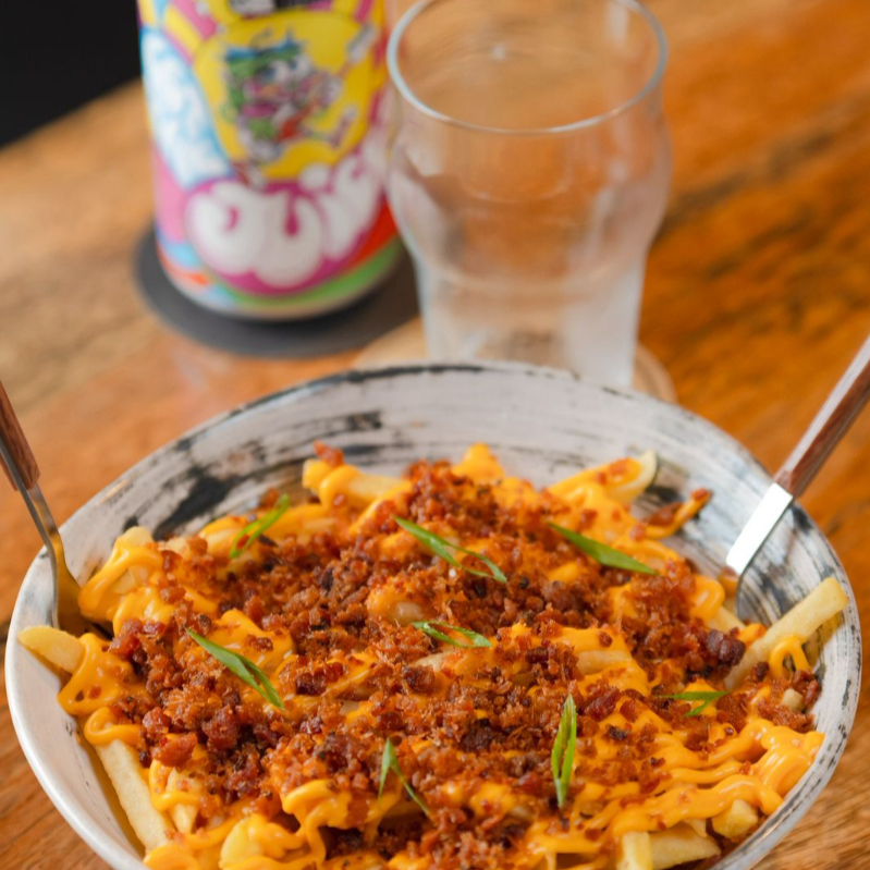 Batata frita, cheddar cremoso caseiro e farofa de bacon crocante.