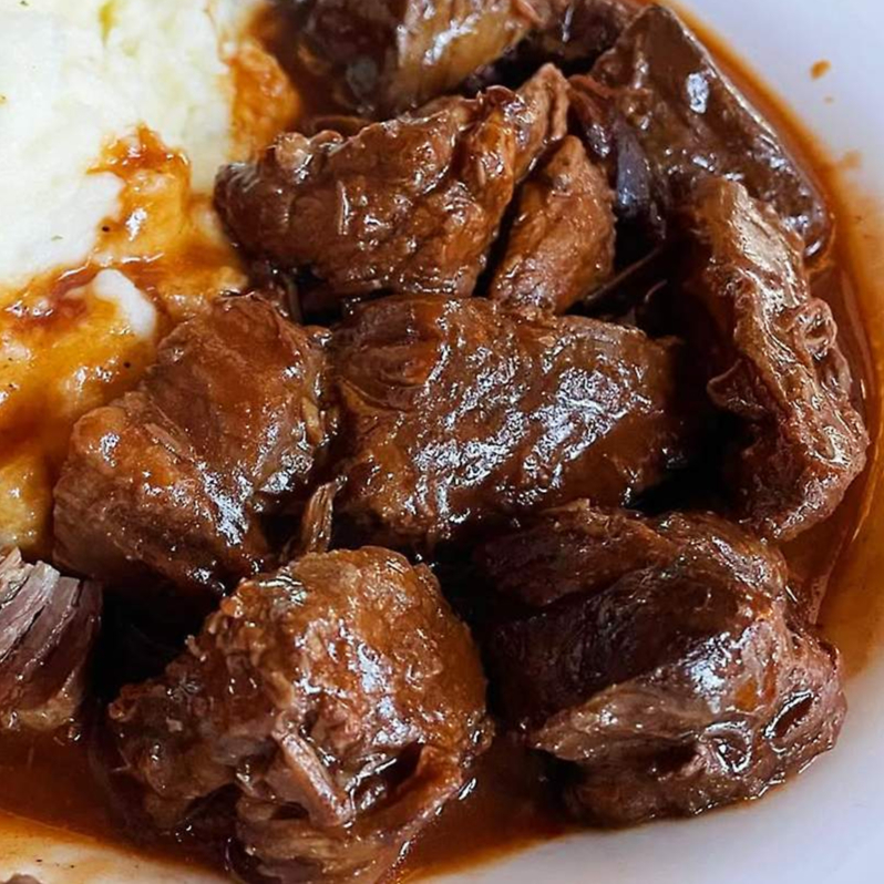 Assado de panela. Duas opções de acompanhamento, escolha a seguir.