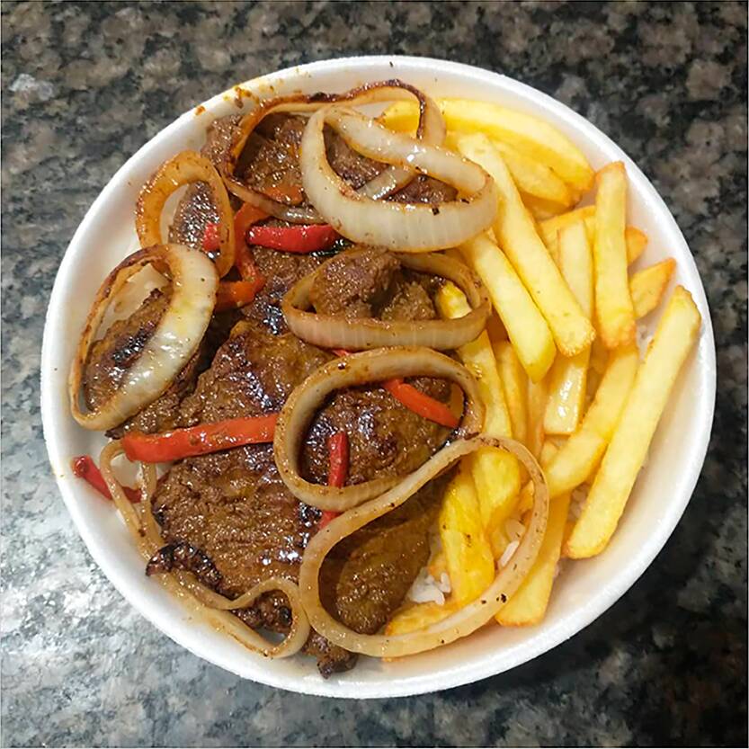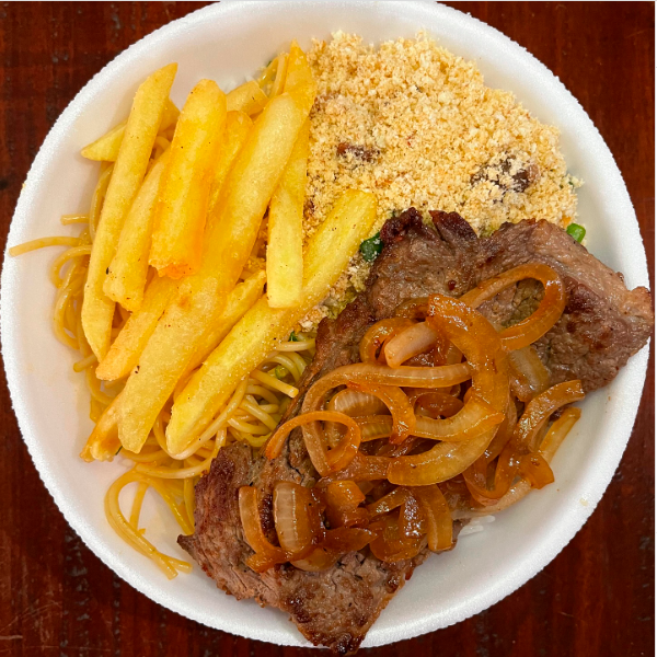 Bife acebolado saboroso servido com arroz, feijão e uma porção de batata frita.