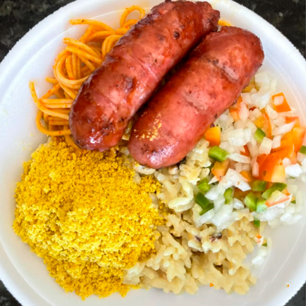 Calabresa acebolada. Duas opções de acompanhamento, escolha a seguir.