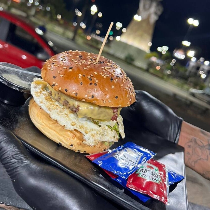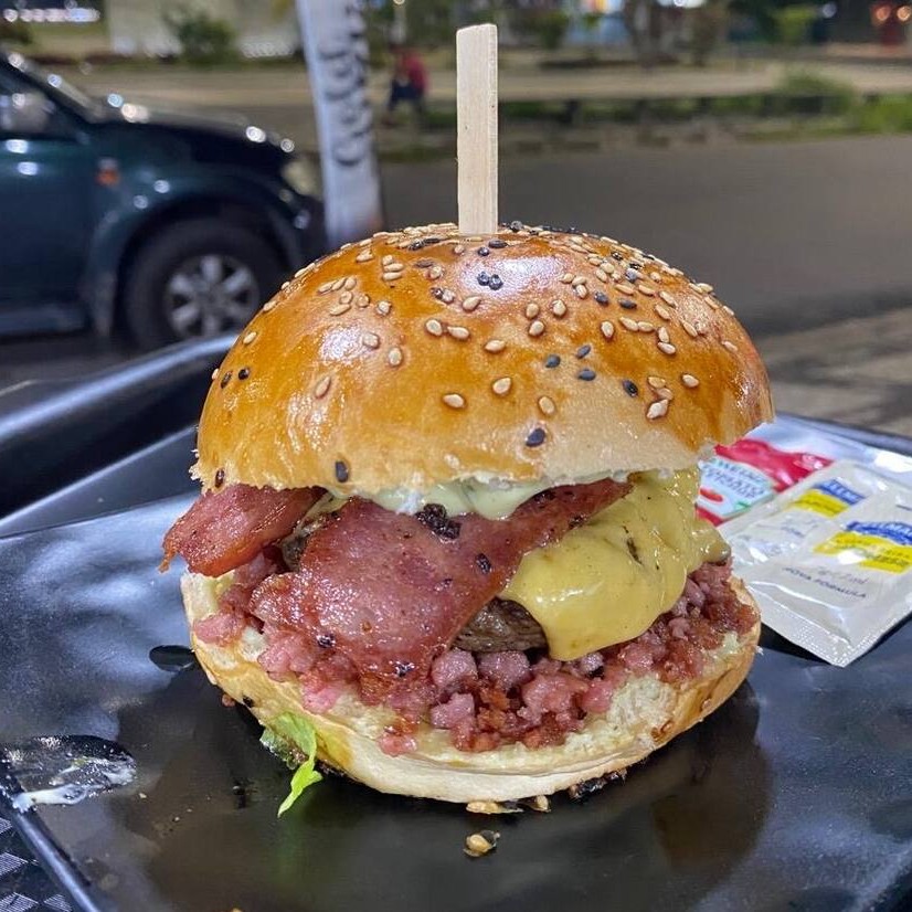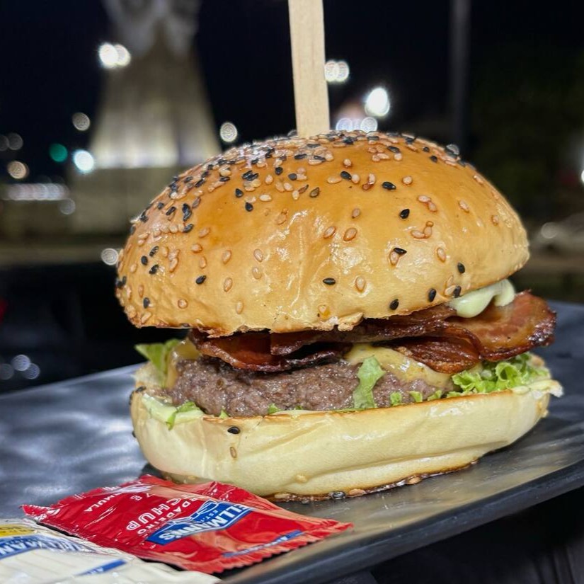 A combinação perfeita de sabores com pão de gergelim, blend de carne, salada, queijo prato, calabresa e bacon.